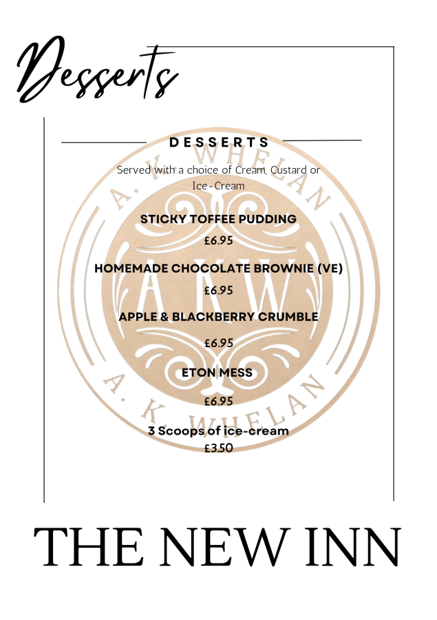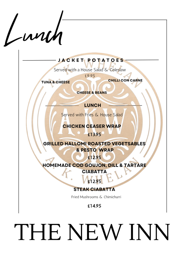 At The New Inn, our food is locally sourced and made fresh everyday, we have a fantastic menu with Vegetarian and Vegan options, daily specials and delicious roasts on Sundays.